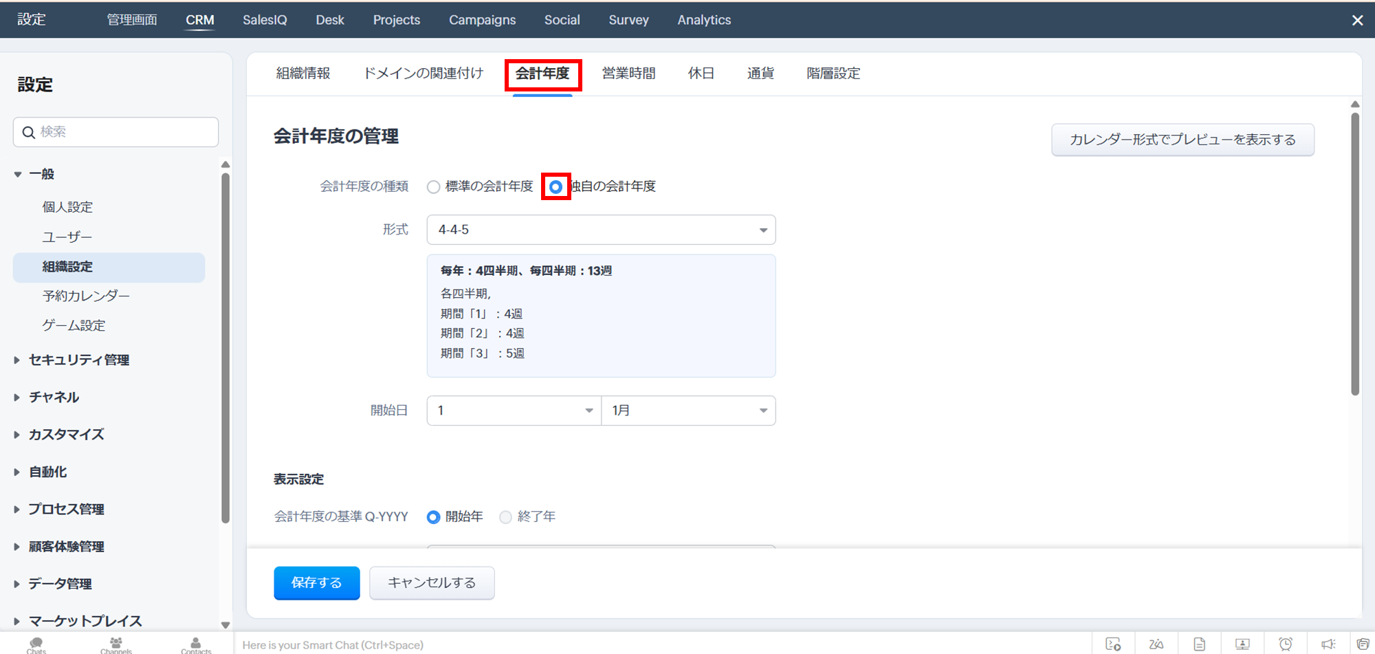 会社の会計年度に合わせて設定を行います。デフォルトでは1月始まりに設定されています。