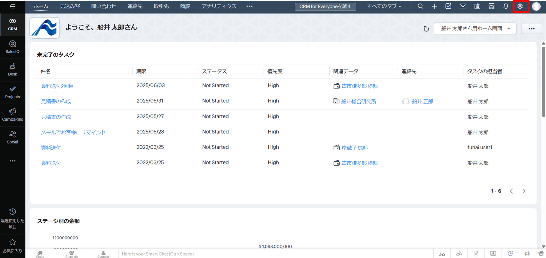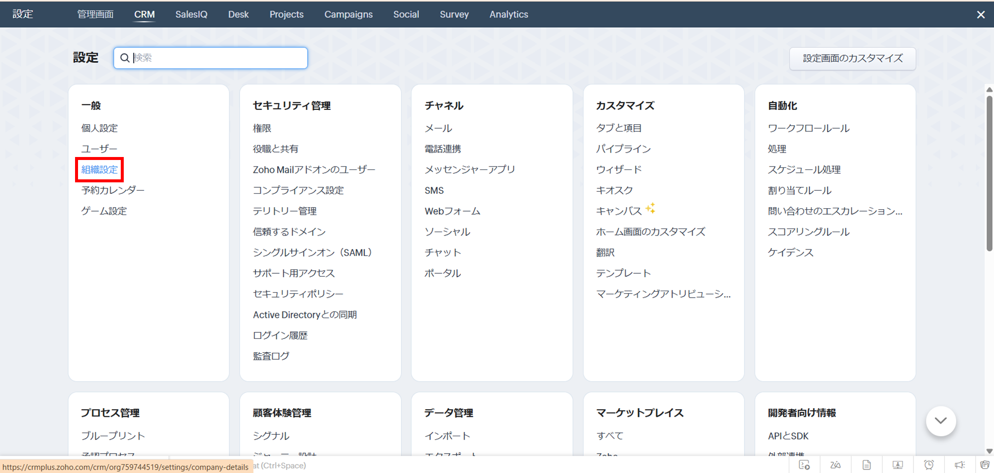 Zoho CRMにログイン後、画面右上の歯車アイコンをクリックして設定画面を開きます。