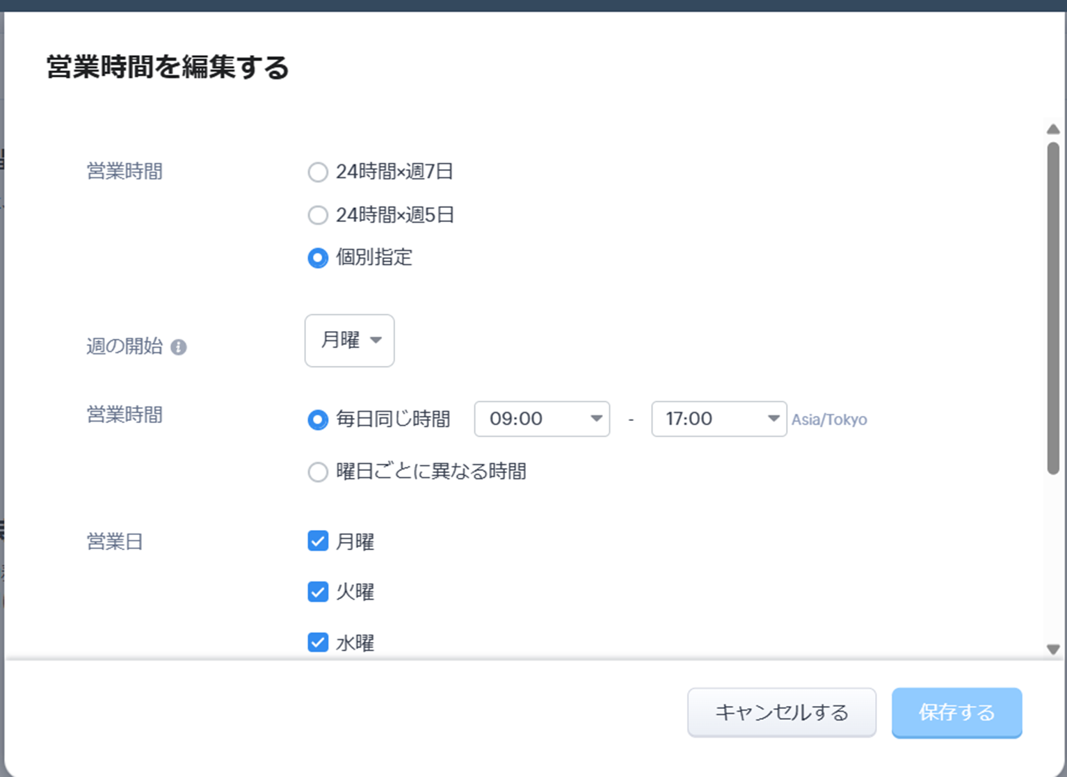 「個別指定」では、週の開始曜日、営業開始時間、営業終了時間を設定できます。