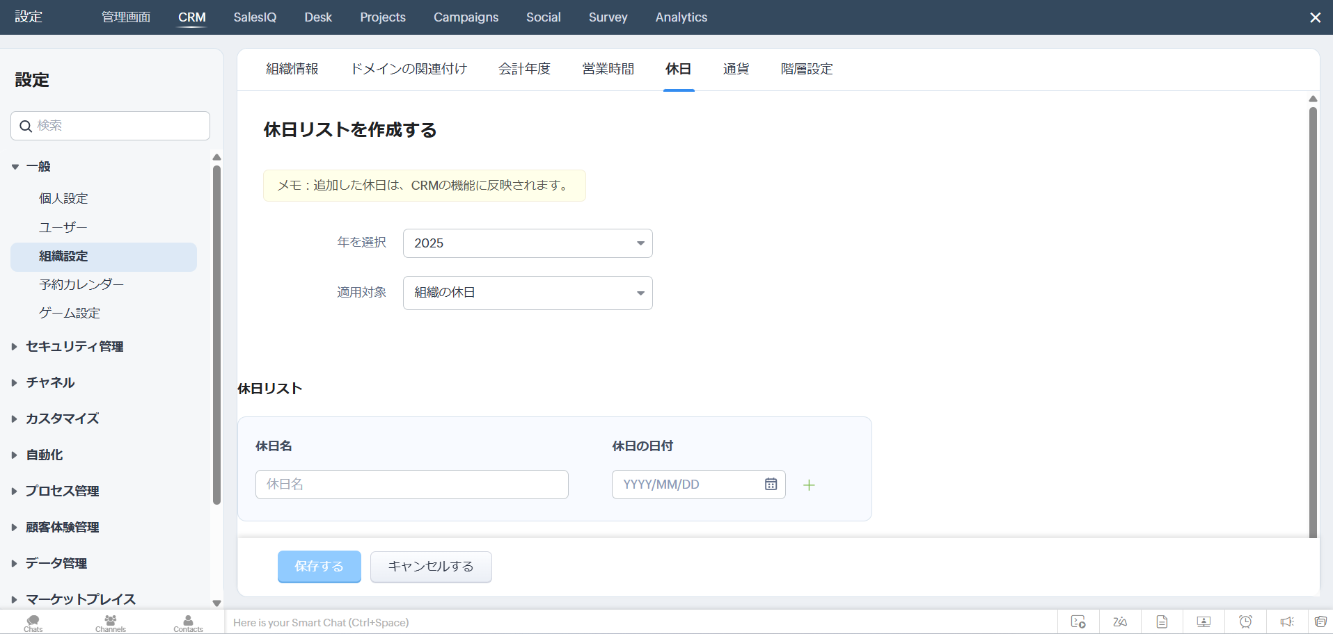 年を選択し、適用対象を「組織の休日」に設定します。