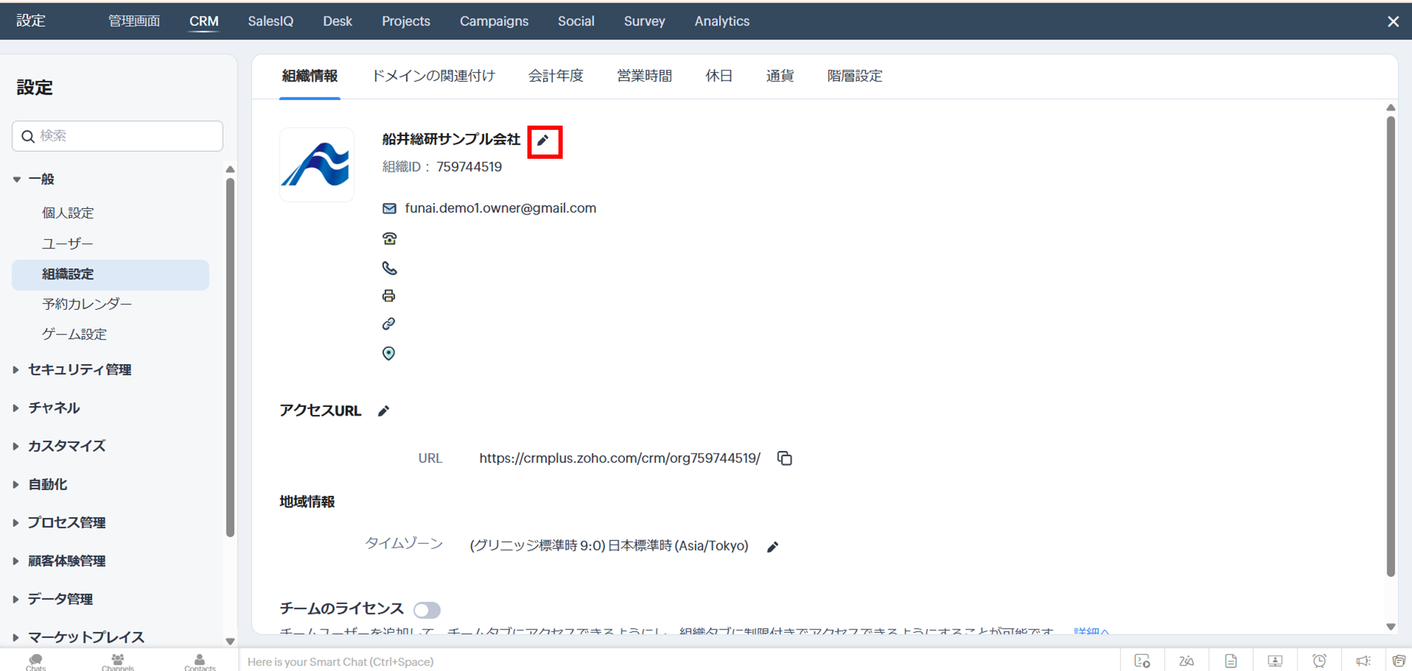 「組織情報」タブの鉛筆アイコンをクリックして、会社名、住所、連絡先などの情報を入力します。
