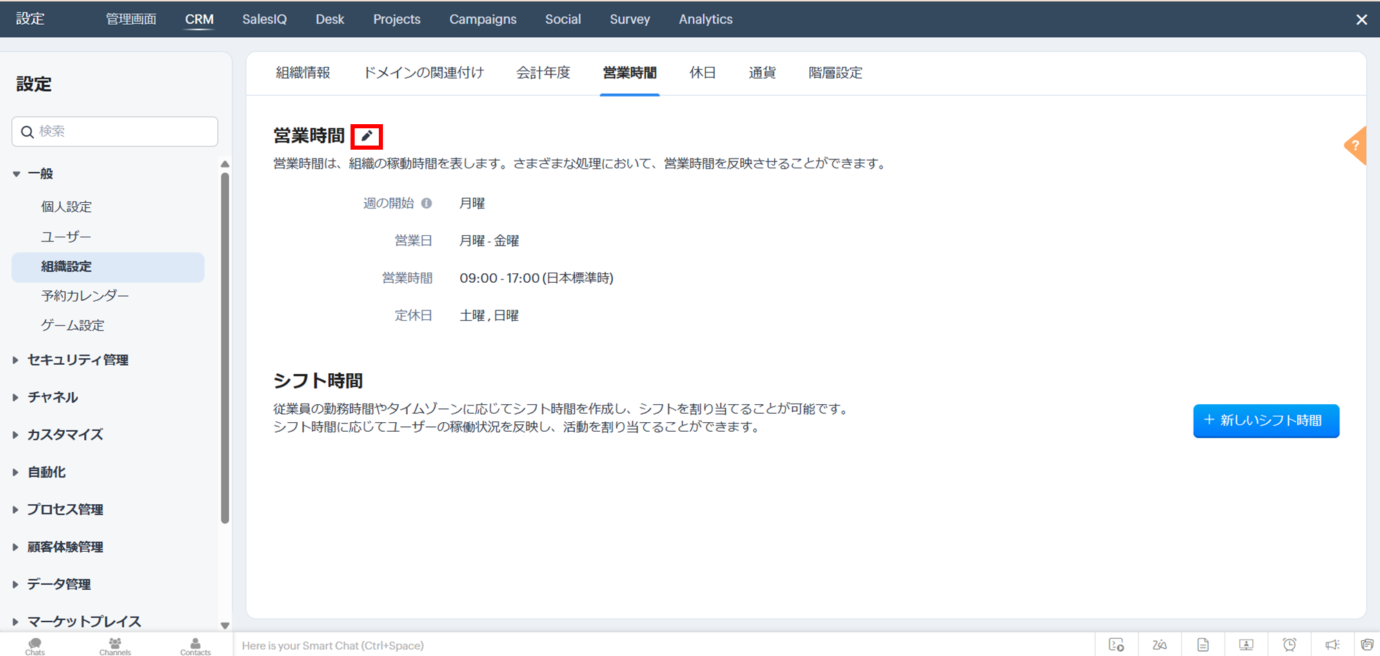 営業時間は、デフォルトでは「24時間、7日営業」となっています。以下の選択肢から設定します。