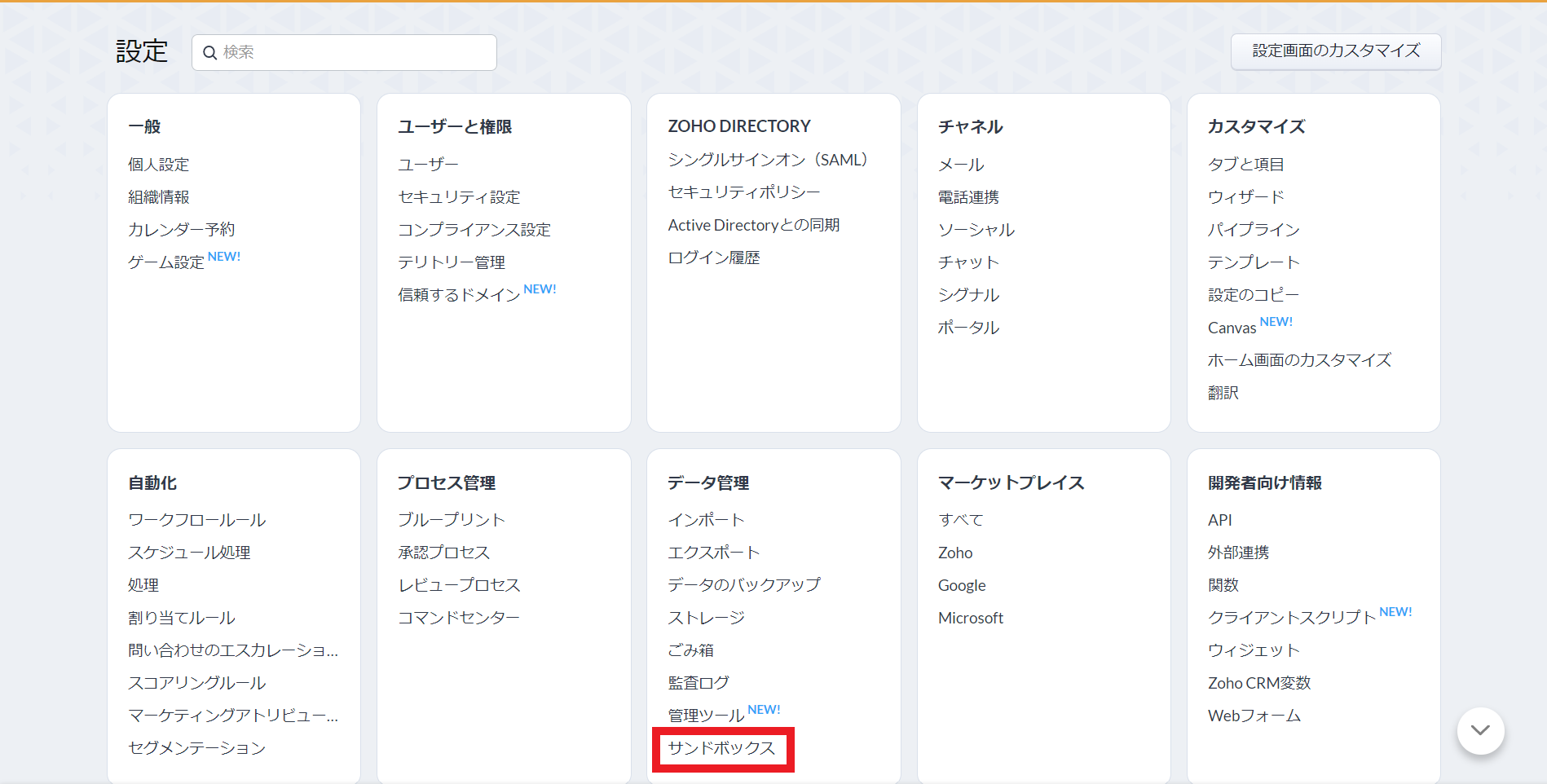 Zoho CRM本番環境の設定だけをサンドボックスで利用したい場合は[設定]を選択します。