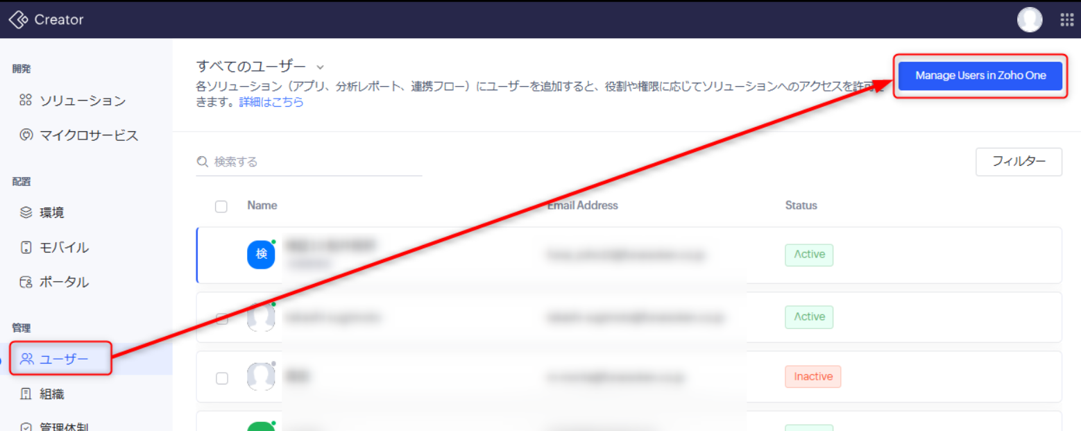 1)Zoho Creatorの「ユーザー」>「Manage Users in Zoho One」をクリックします。