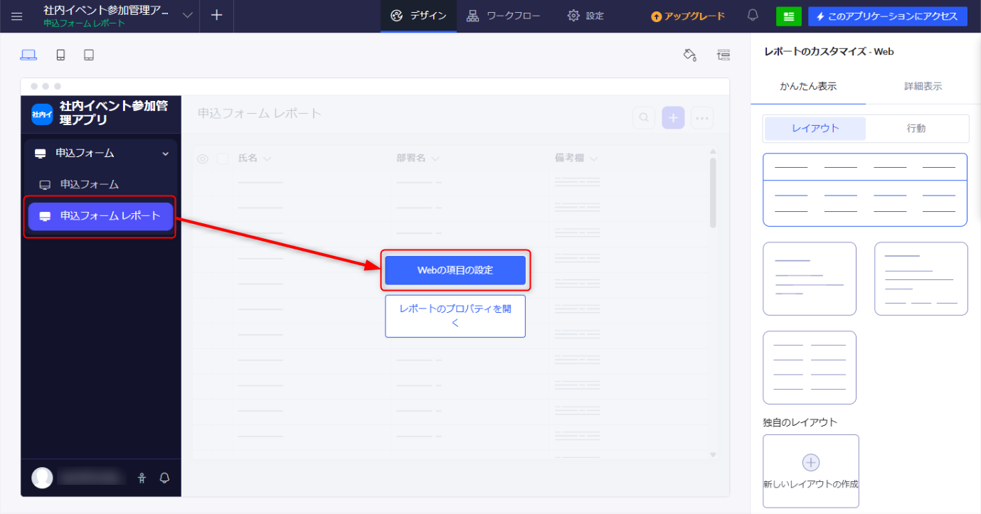2)氏名表示を変更したいレポートの「Webの項目の設定」をクリックします。