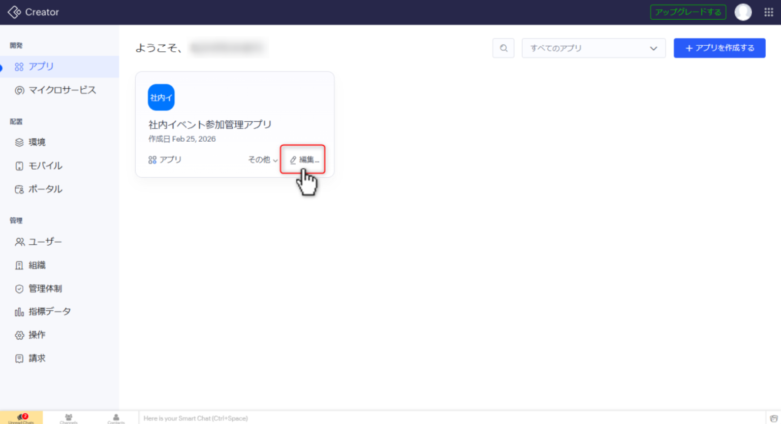 1)Zoho Creatorを開き、氏名表示を変更したいアプリの「編集」をクリックします。
