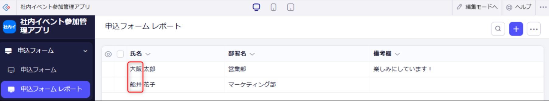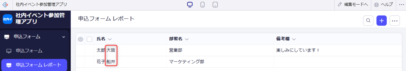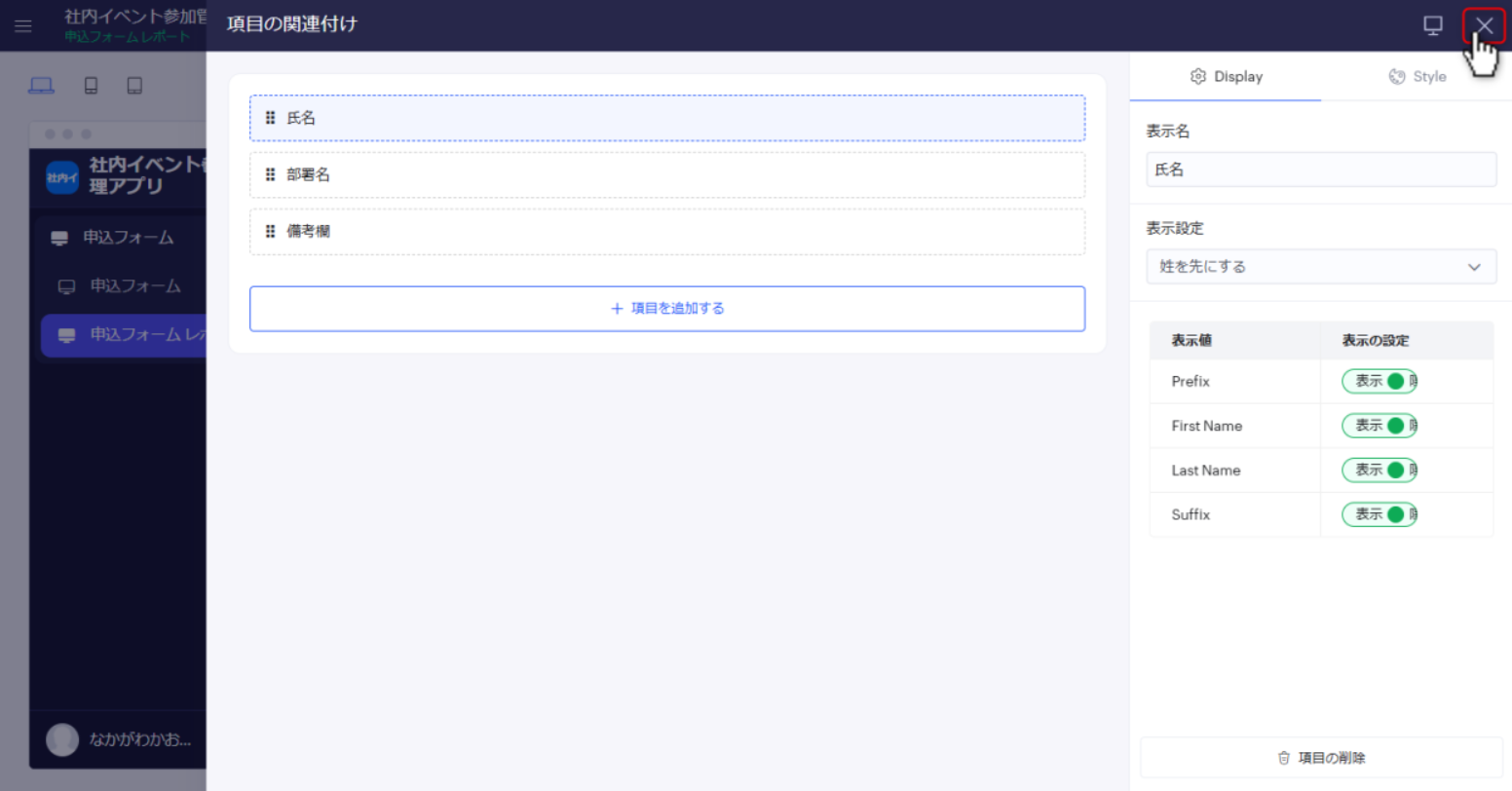 Zoho Creatorで作成するアプリのレポート画面では、氏名の初期表示が「名姓」で表示されますが、