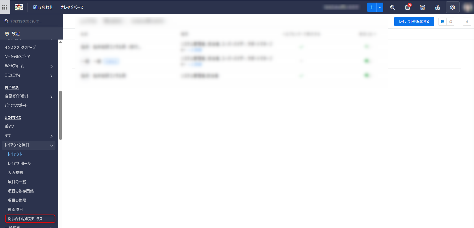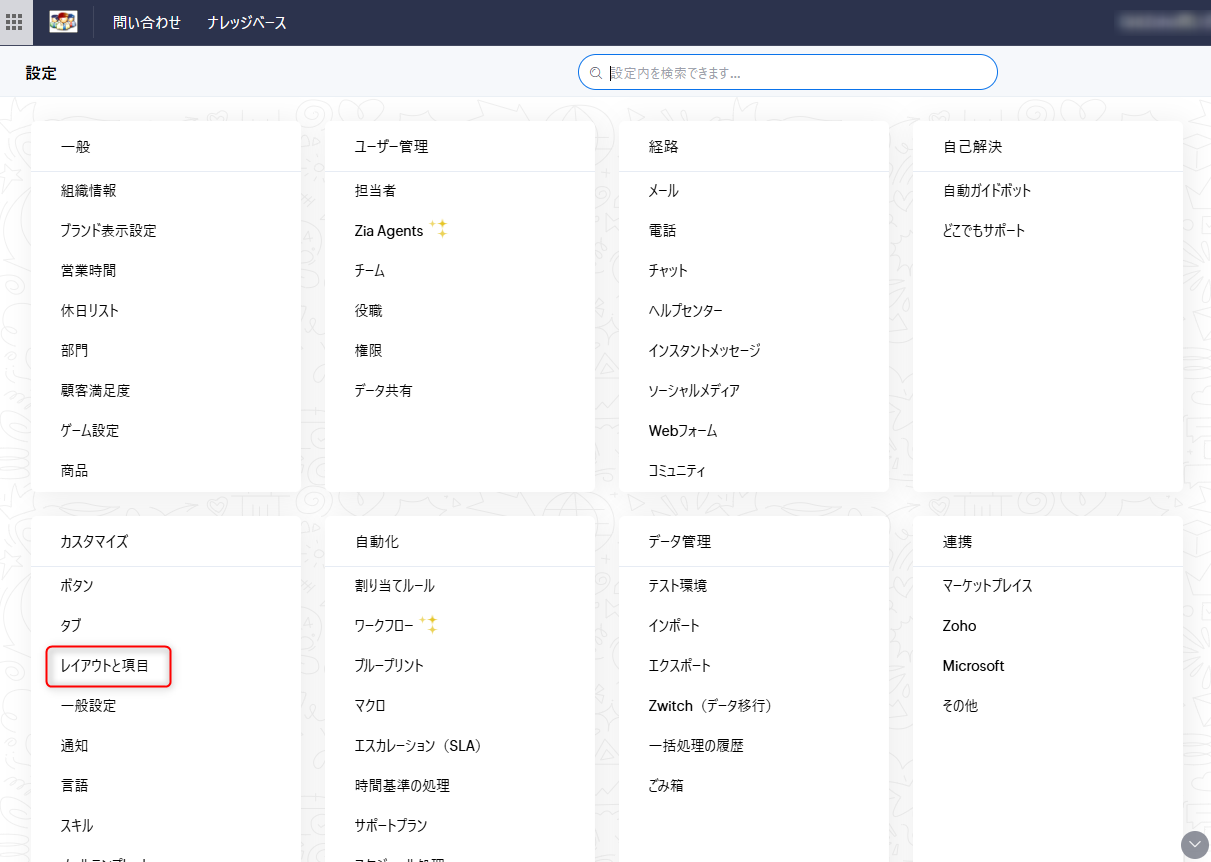 1)Zoho Deskの設定画面内より「レイアウトと項目」をクリックします。