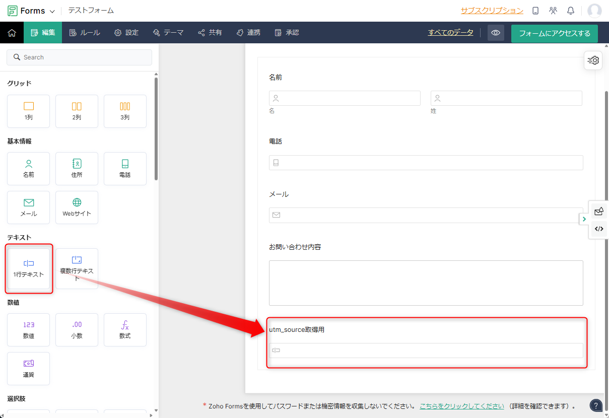 「1行テキスト」の項目を取得したいUTMパラメータ分だけ追加します。