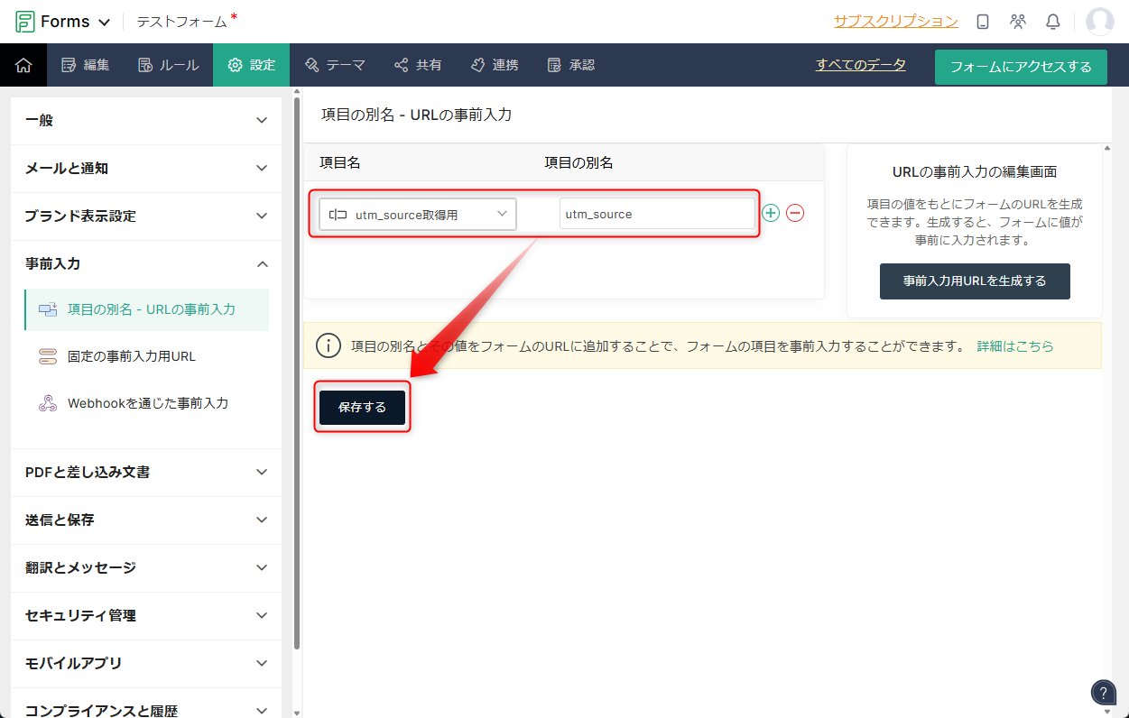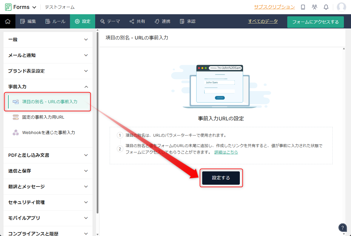 設定>事前入力の「項目の別名-URLの事前入力」>設定する をクリックします。