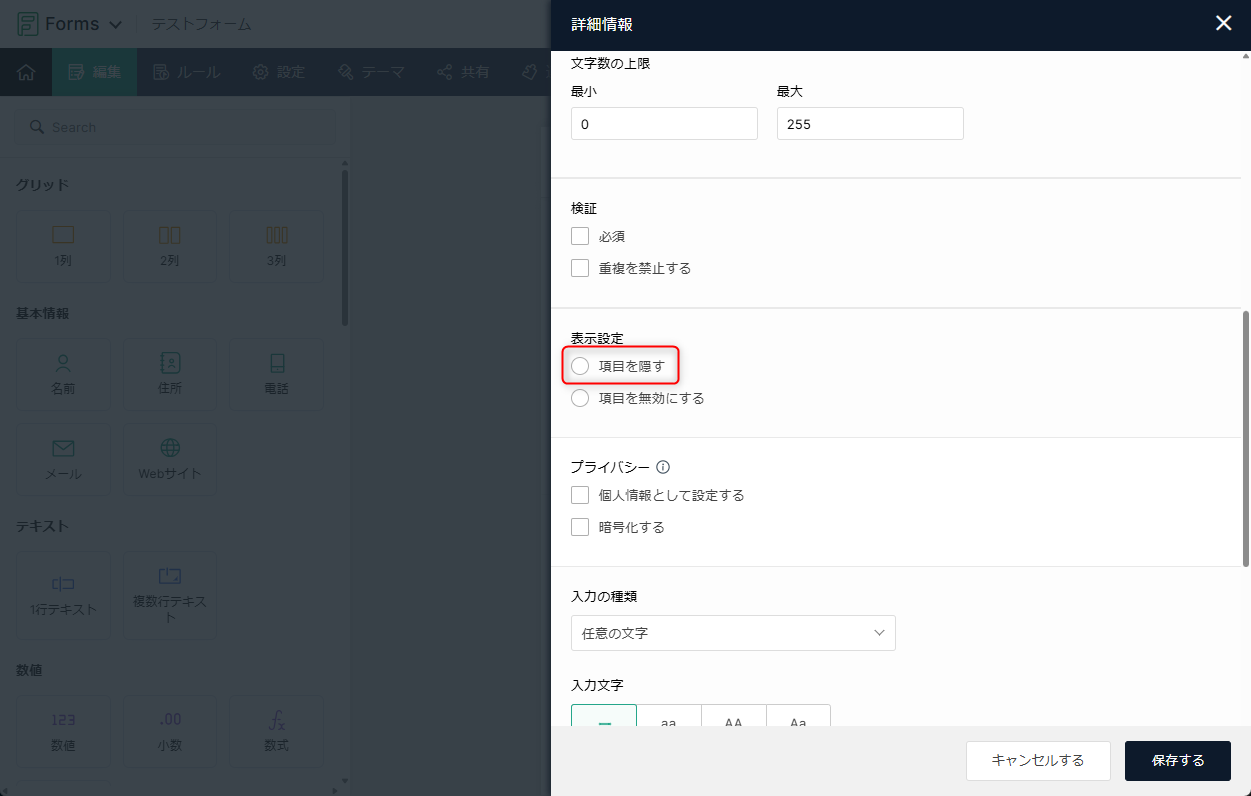 当該項目の設定画面内、表示設定「項目を隠す」にチェックを付けて保存します。