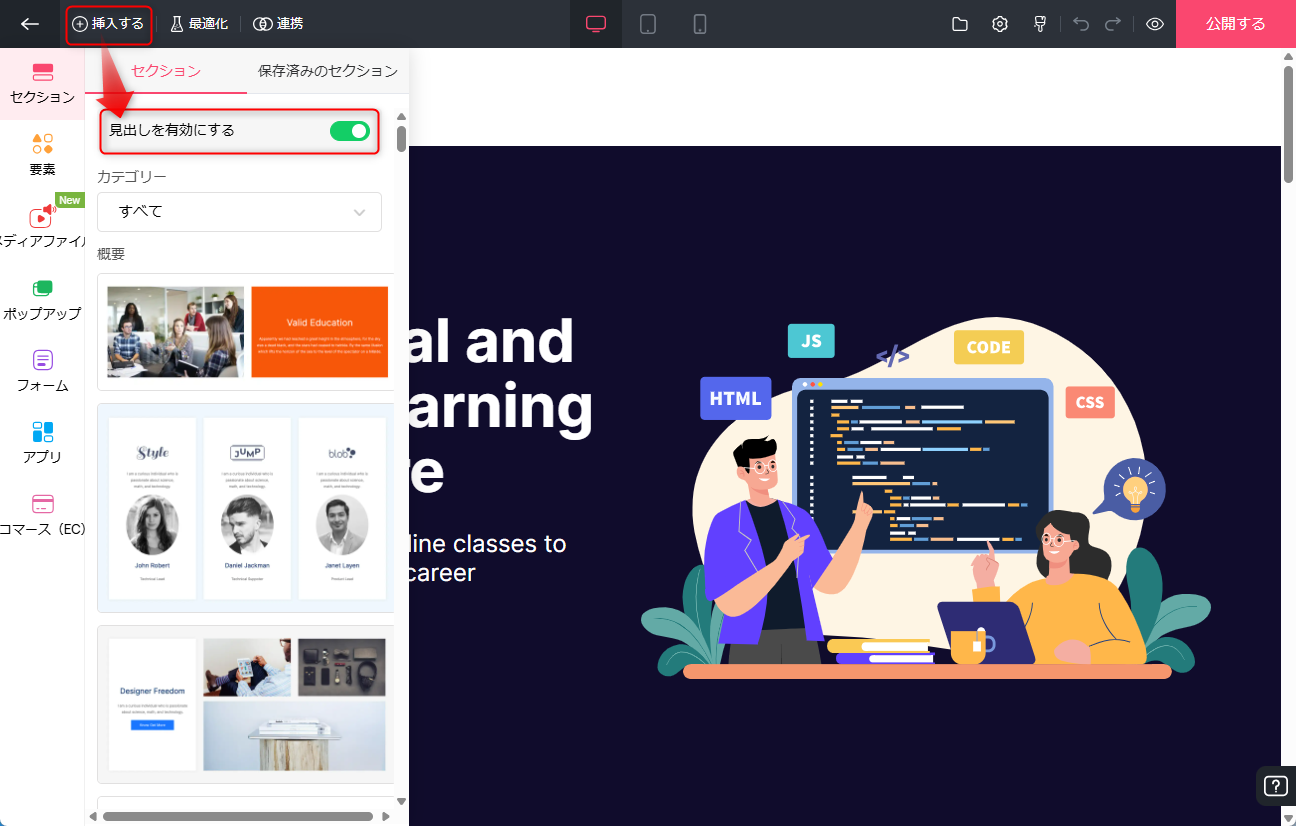 「+挿入する」ボタン >「見出しを有効にする」のオン・オフで制御できます。