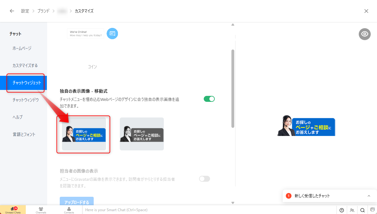 チャットウィジェット表示画像の設定画面へのアクセス方法