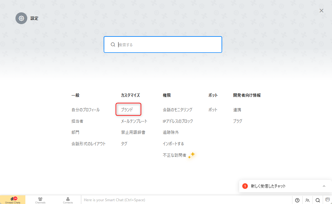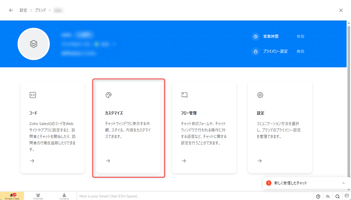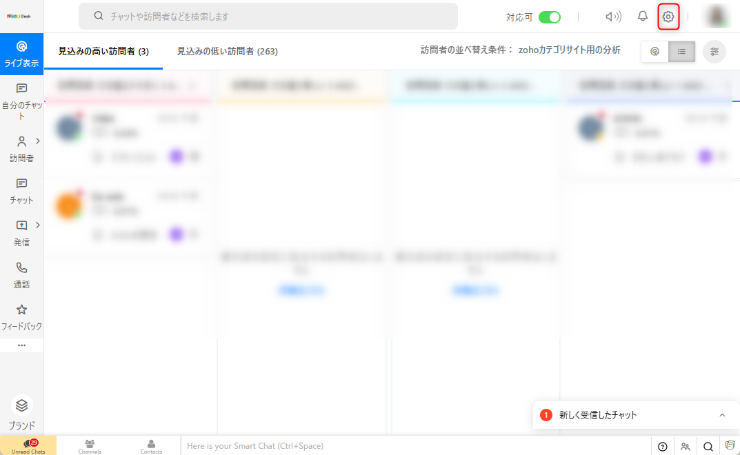 1)Zoho SalesIQにログインし、画面右上の歯車アイコンをクリック